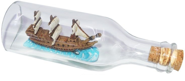Кораблик зафиксирован внутри с помощью безопасного силиконового клея, дно бутылки открыто и это может служить убежищем для некрупных рыбок.