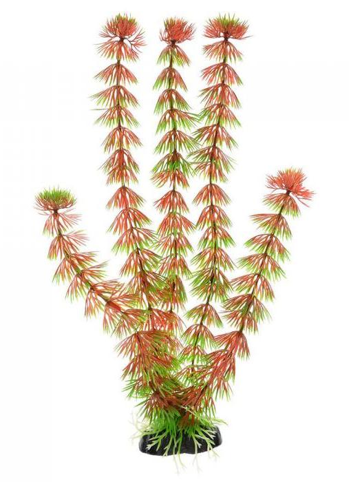 Пластиковое растение Кабомба красная это естественно выглядящее искусственное растение с удлиненным прямостоячим стеблем и с супротивным или мутовчатым листорасположением. Лепестки венчика фиолетовые, у основания с каждого края желтое пятно. Кабомбу выбирают для создания контраста с широколиственными водными растениями темно-зеленого цвета. Оно также идеально подходит для маскировки оборудования, например, фильтров и нагревателей.