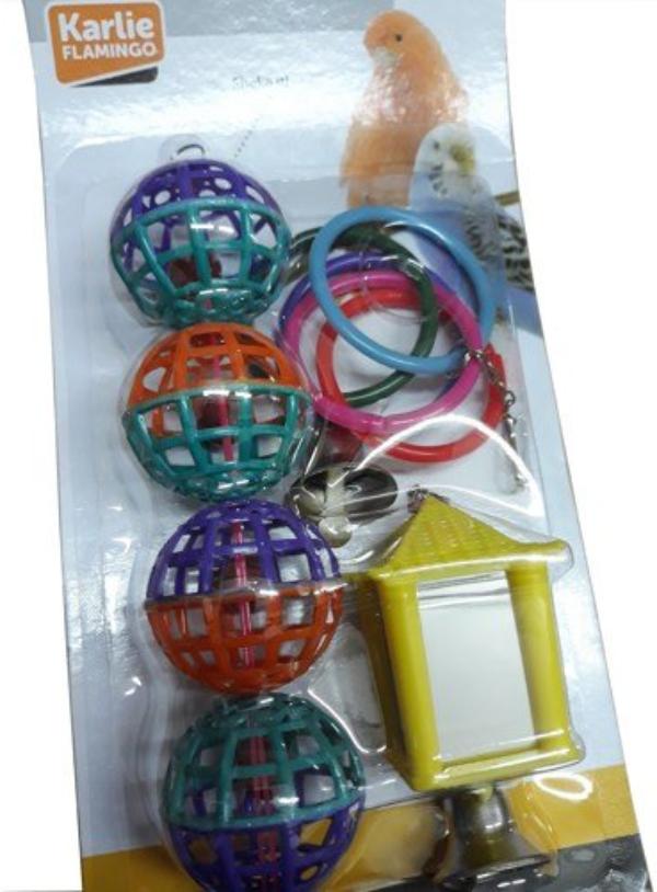 Игрушка для птиц состоит из трех частей: пять колец с колокольчиком, зеркальца с колокольчиком и 4 шариков с бубенцами внутри.