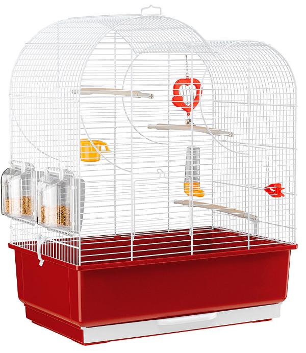 Аксессуары в комплекте: поворотные кормушки, пластиковые жердочки с резиновым покрытием, поилка, прищепка для овощей, небольшая миска и игрушка-зеркало с маленьким колокольчиком.