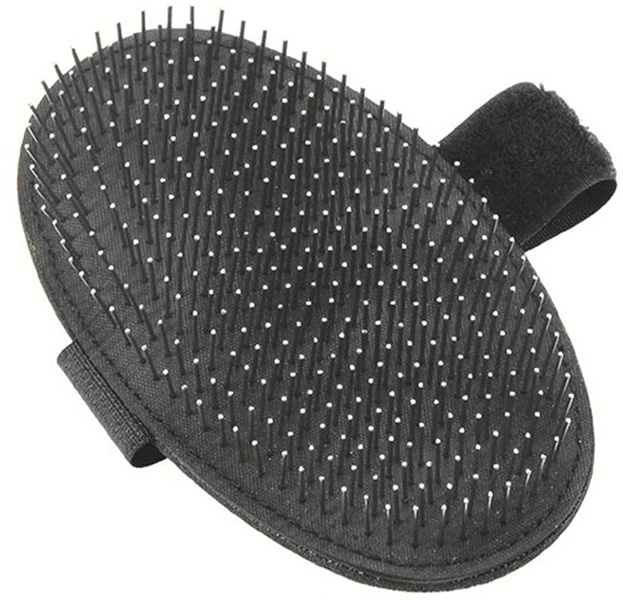 Она представляет собой мягкое овальное основание, на котором располагаются металлические зубья. Щетка прекрасно удаляет старую шерсть и грязь, способствуя оздоровлению и росту новой шерсти. Закругленные кончики зубцов мягко и бережно воздействуют на кожу животного, а также создают дополнительный массажный эффект. Для более удобного использования щетка крепится на руку с помощью специального ремешка на липучке.
