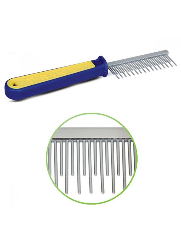Triol 308 Расческа комбинированная Спорт идеально подходит для ухода за нежной, тонкой и гладкой шерстью питомцев. Она удаляет уже выпавшие волосы и уменьшает линьку.