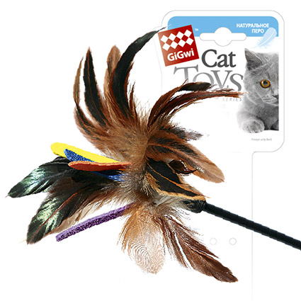 Дразнилка с перьями на стеке. Размер 51 см. Пластик, текстиль, перо.