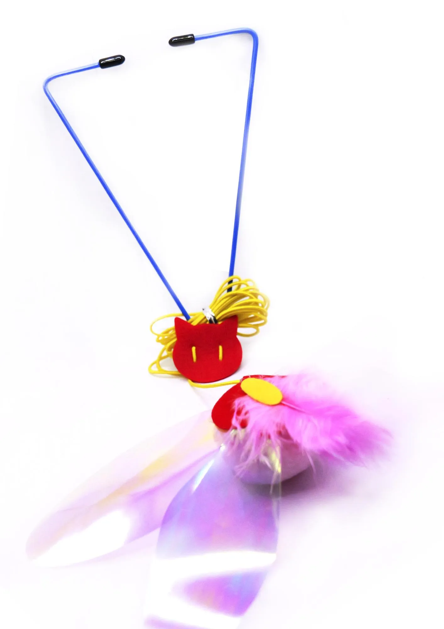 Главная особенность игрушки — её можно подвесить за дверную раму и отрегулировать длину шнура. Кошка может играть по настроению в обычное время и развлекаться, когда одна дома. Мячик в форме бабочки снабжён грузиком, который увеличивает амплитуду движения дразнилки. Кроме этого: