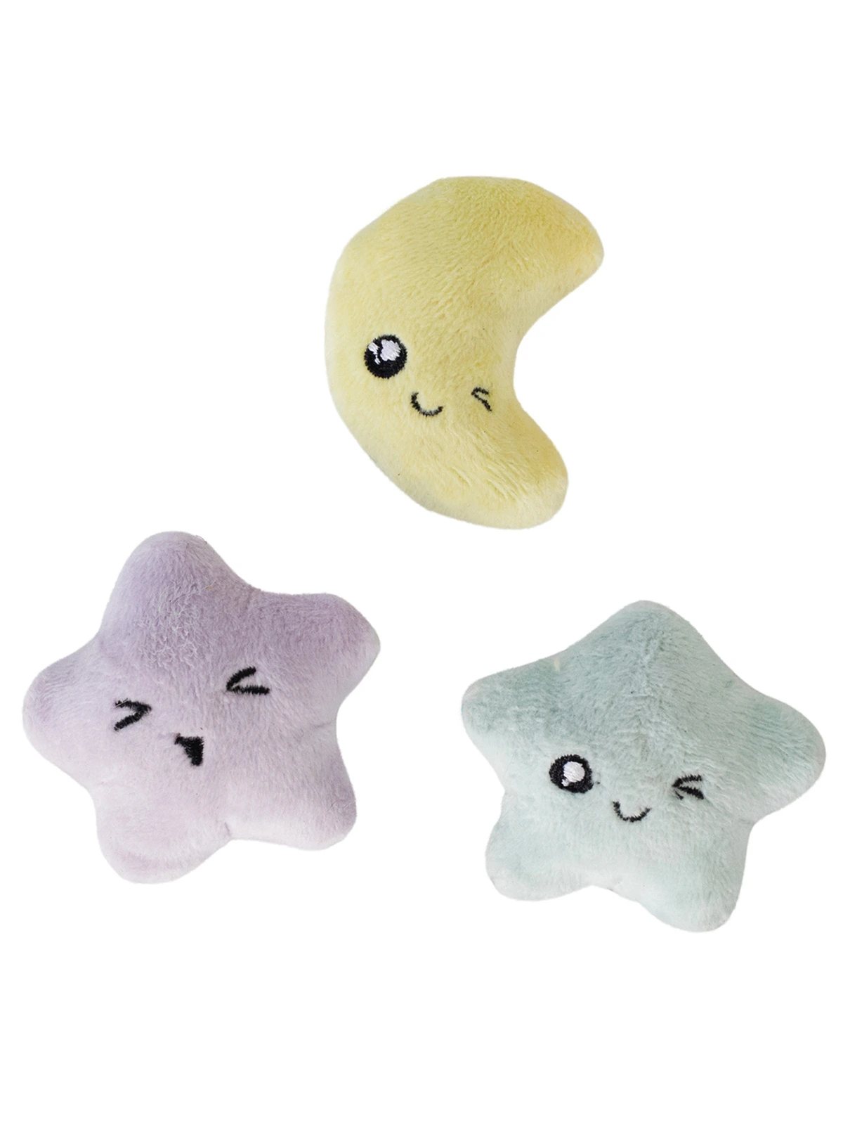 Одна голубая звездочка, входящая в набор, светится при касании. Батарейка не сменная. Каждая игрушка пропитана кошачьей мятой и шуршит, чтобы стимулировать и поощрять длительные игры. Подходит для кошек всех возрастов.