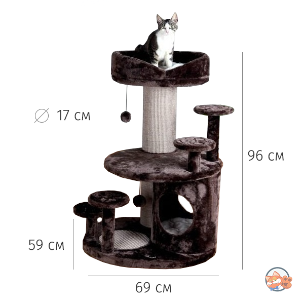 Размер платформы - 69х59 см, диаметр столбика - 17 см. Кот сможет точить когти и забудет о вашей мебели и обоях. Натуральный сизаль, которым обкручен столбик, гарантирует привлечение внимания любимца. 4 платформы дают пространство для игр и активных перемещений. Отдыхать питомец будет в домике и лежаке на мягких подушках, наполненных шерстью. Для игр предусмотрены 2 мягкие игрушки на веревочках.