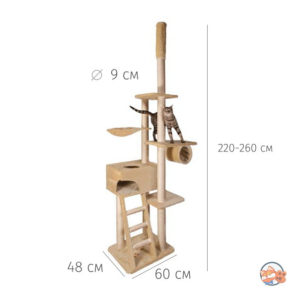 Ваш кот до достоинству оценит комплекс, на котором можно перемещаться от потолка до пола. Разноуровневые площадки, обтянутые плюшем, позволяют играть и отдыхать после сытного ужина. Мягкий лежак, труба из плюша - все это в распоряжении вашего любимца! Для удобства и максимально комфортного времяпрепровождения комплекс оборудован домиком, внутри отделанным шерстью. Соединяет нижний уровень и вход в домик лестница, ступеньки которой обкручены натуральным сизалем. Основание имеет размер 60х48 см., высота столбика регулируется.