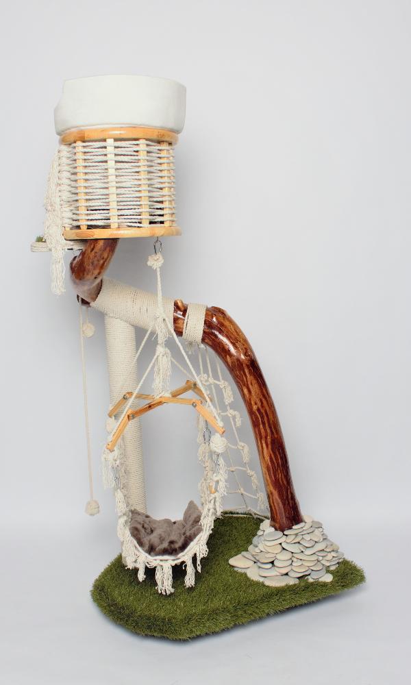 Комплекс состоит из уютного домика с теплым овечьим мехом, лежанки на домике с подушкой из меха. Кроме того есть роскошный гамак с меховой подушкой. И собственно когтеточка с сеткой из натурального каната.