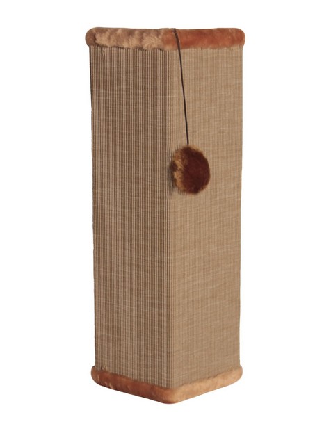 Обратите внимание на угловую когтеточку "Cat House" высотой 60 см и шириной 30 см. Она крепится прямо на угол, а потому не будет загромождать пространство в небольшой квартире. Чтобы кот не заскучал, сверху крепится игрушка из плюша на резинке. Специальная циновка отлично снимет старый слой когтя, позволит зацепиться коготками за поверхность и тянуть спинку.