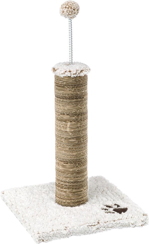 Столбик-когтеточка имеет центральную колонну из прочного картона, маленькую игрушку в виде шарика, закрепленного на пружинке, и мягкое квадратное основание с обивкой из плюша.