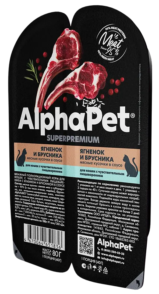 AlphaPet Superpremium Ягненок и брусника в соусе — влажный полнорационный корм для кошек с чувствительным пищеварением.