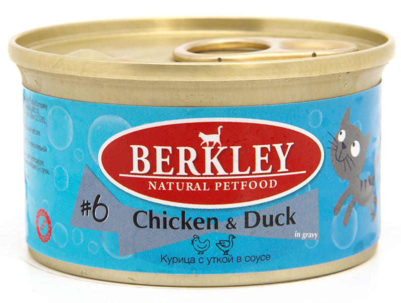 Berkley Tay для кошек №6 (Курица, утка) — полнорационное консервированное питание для взрослых кошек - кусочки курицы и утки в нежном соусе.
