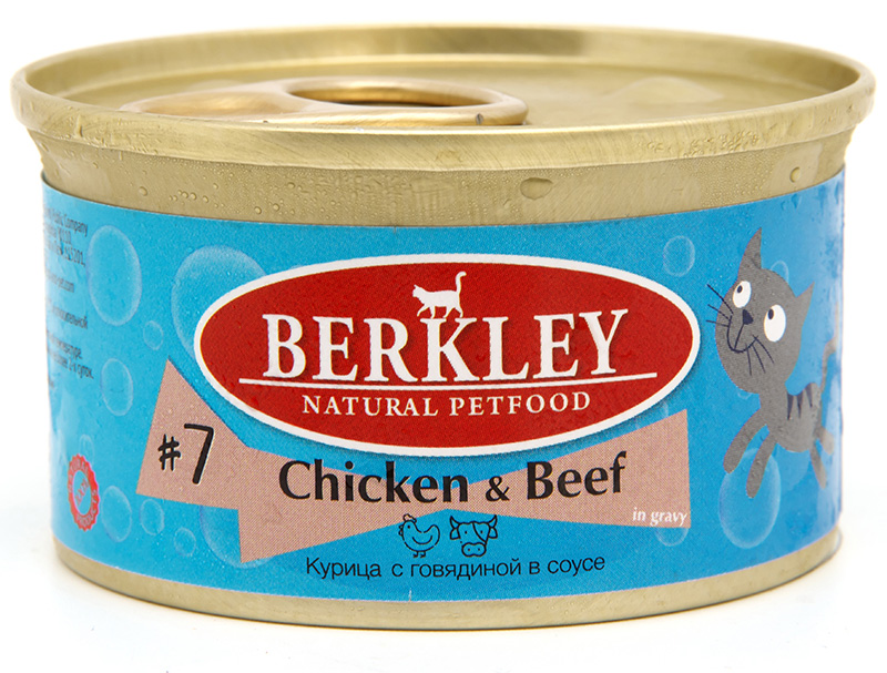 Berkley Tay для кошек №7 (Курица, говядина) — полнорационное консервированное питание для взрослых кошек - кусочки курицы и говядины в нежном соусе.