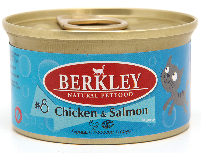 Berkley Tay для кошек №8 (Курица, лосось) - полнорационное консервированное питание для взрослых кошек - кусочки курицы и лосося в нежном соусе.