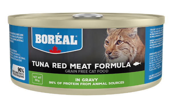 Boreal Cat Красное мясо тунца в соусе - это полнорационный влажный корм для кошек всех возрастов. Содержит 96% животного белка, и в нём почти нет углеводов, чтобы снизить риск нежелательного набора веса.
