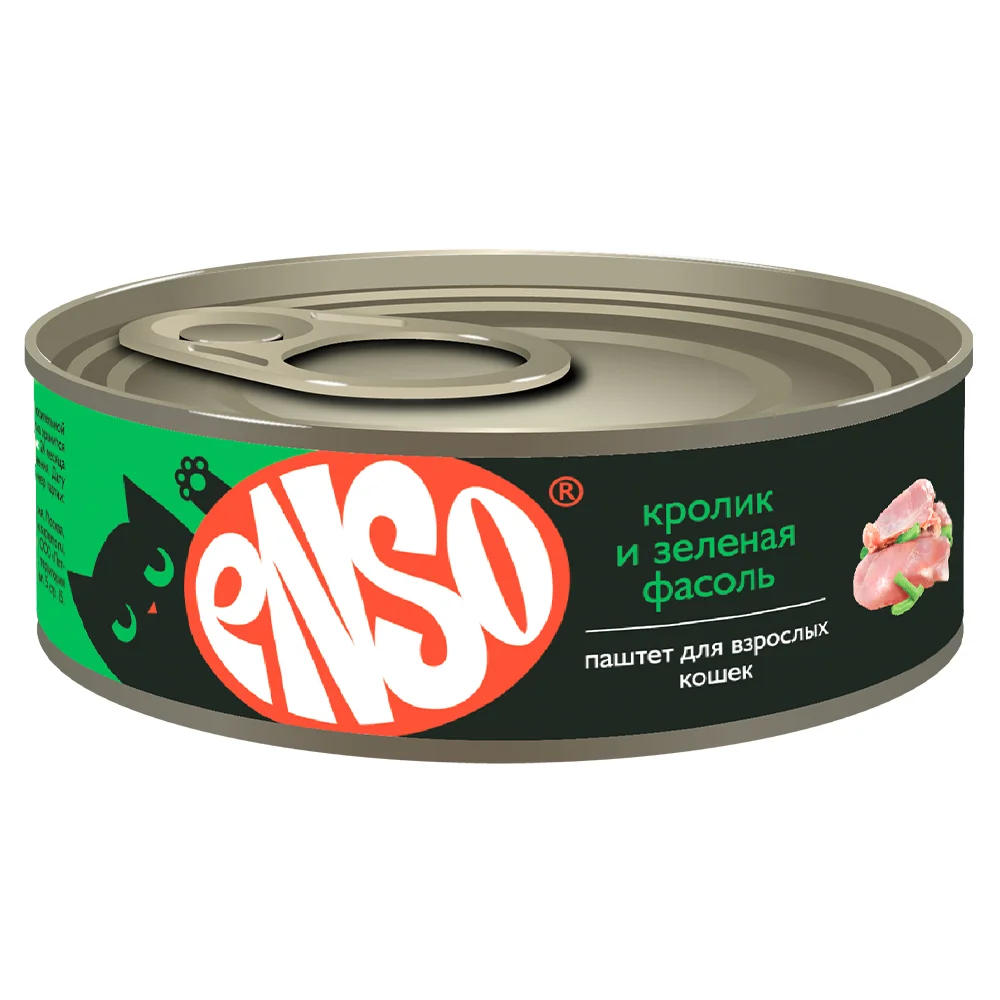 ENSO Консервы для кошек (Кролик, фасоль) — полнорационный корм для взрослых кошек, паштет с кроликом и зеленой фасолью.