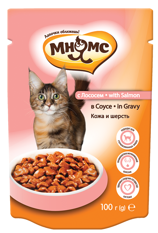 Мнямс Паучи с лососем в соусе, 100 г - это сбалансированный влажный корм для взрослых кошек, склонных к аллергии, приготовленный без добавления искусственных красителей и консервантов.