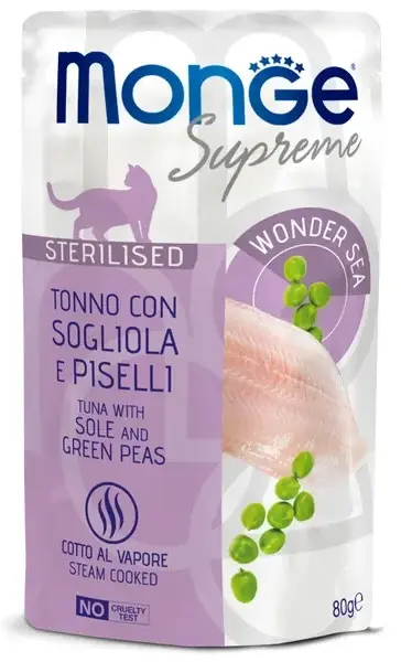 Monge Supreme Sterilized Cat Пауч с тунцом, желтоперой камбалой и зелёным горошком – дополнительный консервированный корм для стерилизованных кошек. Настоящий деликатес для четвероногих гурманов приготовленный на пару из высококачественных продуктов на основе свежего тунца, который является источником белка высокой пищевой ценности.