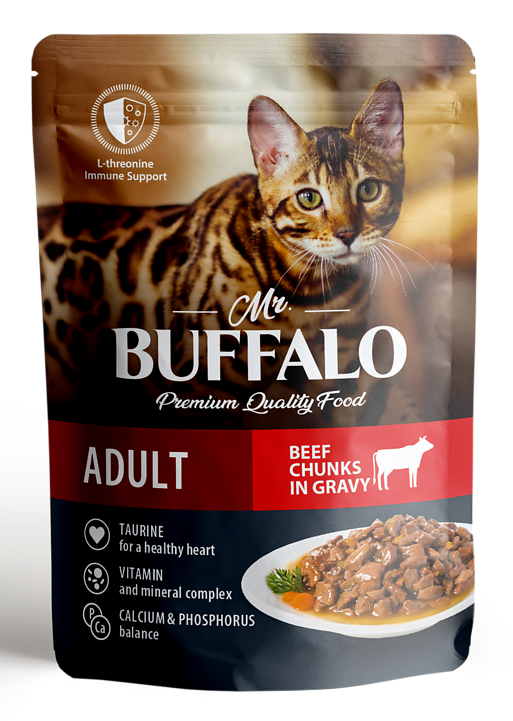 Mr. Buffalo Cat Adult (Говядина в соусе) - полнорационный влажный корм с говядиной для взрослых кошек изготовлен из натуральных, гипоаллергенных и легко усваиваемых ингредиентов. В оптимальном количестве содержит животные белки и жиры, питательные вещества, а также микроэлементы, необходимые для жизнедеятельности вашей кошки. Благодаря сбалансированному составу поддерживает работу желудочно-кишечного тракта, иммунитета, а также других органов и систем организма.