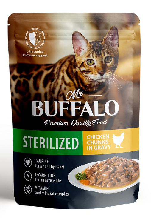 Mr. Buffalo Cat Sterilized (Цыпленок в соусе) - полнорационный влажный корм для взрослых стерилизованных котов и кошек изготовлен из натуральных, гипоаллергенных и легко усваиваемых ингредиентов. В оптимальном количестве содержит животные белки и жиры, питательные вещества, а также микроэлементы, необходимые для жизнедеятельности вашей кошки. Благодаря сбалансированному составу поддерживает работу желудочно-кишечного тракта, иммунитета, а также других органов и систем организма. Рацион разработан на основе исследований в области питания домашних животных, учитывающих особенности организма стерилизованной кошки, изготовлен специально для того, чтобы помочь животному чувствовать себя здоровым и активным.