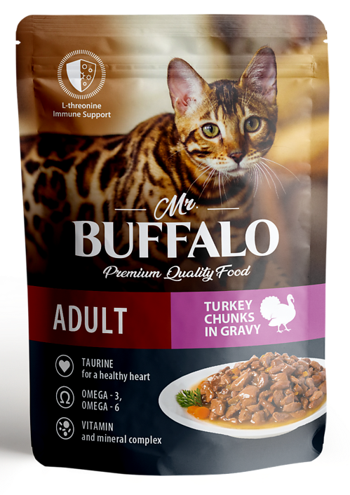 Mr. Buffalo Sensitive Cat Adult (Индейка в соусе) - полнорационный влажный корм Mr. Buffalo с индейкой для взрослых кошек с чувствительным пищеварением изготовлен из натуральных, гипоаллергенных и легко усваиваемых ингредиентов. В оптимальном количестве содержит животные белки и жиры, питательные вещества, а также микроэлементы, необходимые для жизнедеятельности вашей кошки. Благодаря сбалансированному составу поддерживает работу желудочно-кишечного тракта, иммунитета, а также других органов и систем организма.
