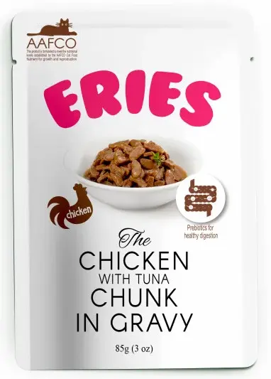 Eries Кусочки курицы и тунца в подливе — влажный корм для кошек, который содержит пребиотики для улучшения пищеварения.