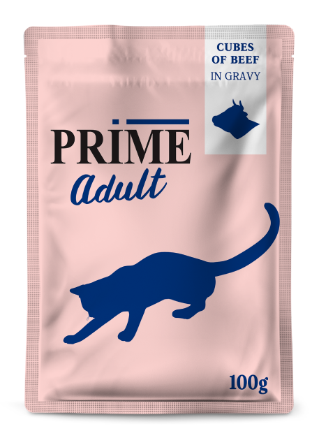 Prime Adult Пауч (Кусочки в соусе с говядиной) – влажный корм для взрослых кошек.