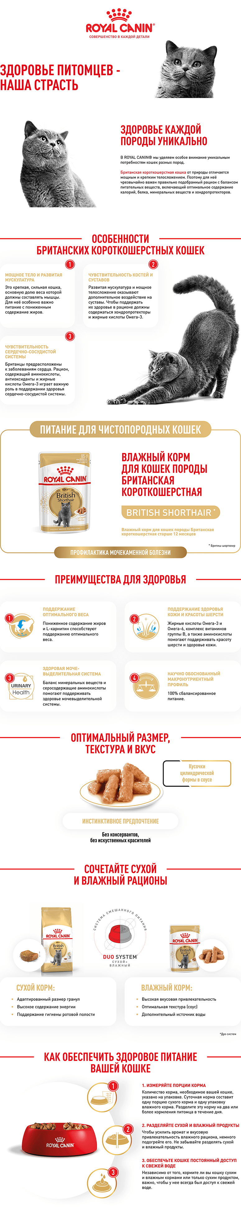 Формула продукта ROYAL CANIN British Shorthair Adult в соусе идеально отвечает потребностям в питании британских короткошерстных кошек.