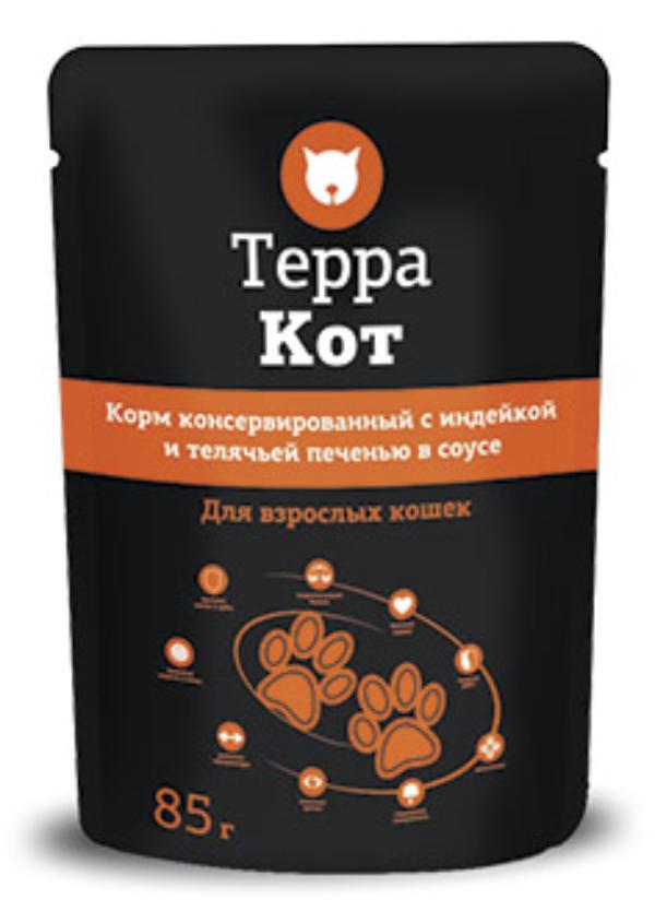 Паучи "Терра Кот" - это влажный корм для взрослых кошек с индейкой и телячьей печенью в соусе.