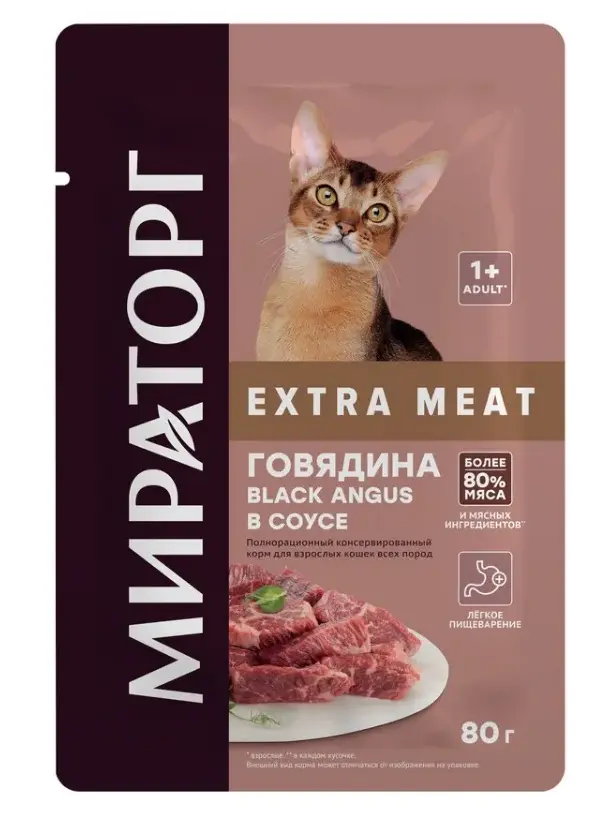 Мираторг Extra Meat для кошек всех пород (Говядина Black Angus в соусе) — полнорационный влажный корм для взрослых кошек всех пород с говядиной Black Angus в соусе.