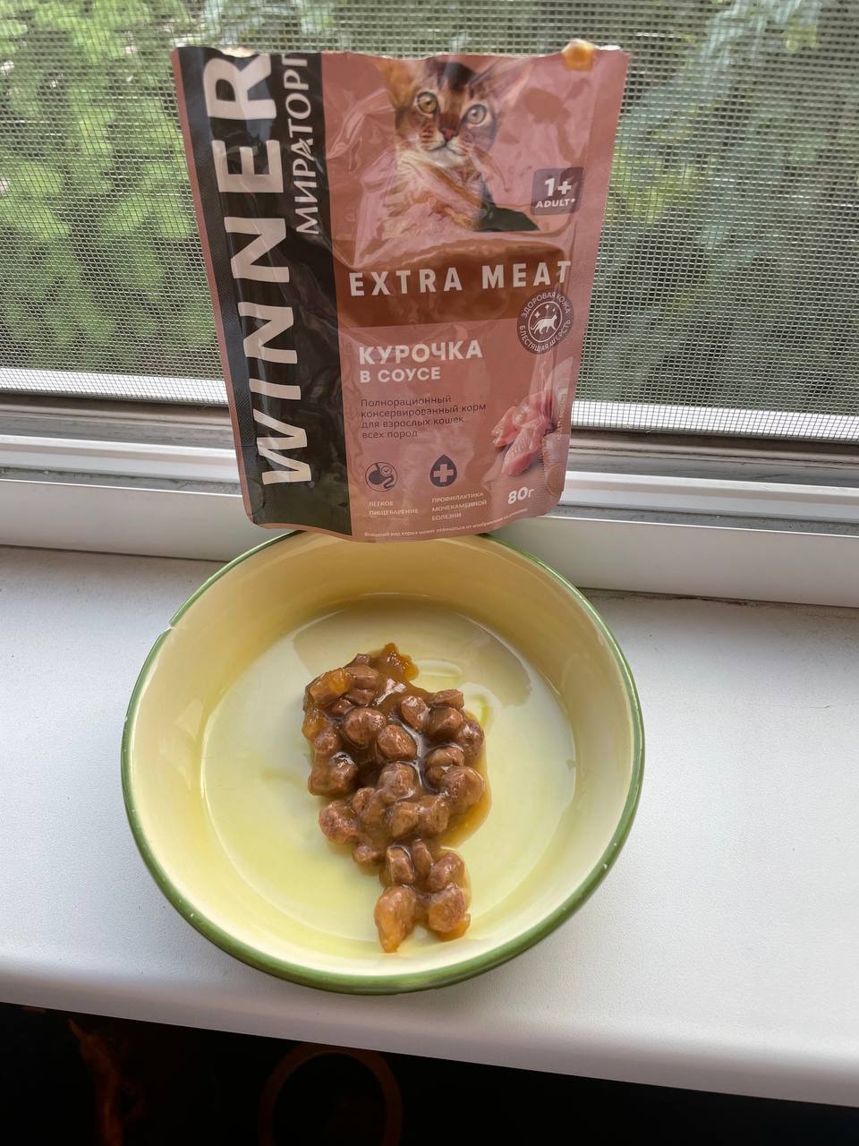 Мираторг Extra Meat для кошек всех пород (Курочка в соусе) — полнорационный влажный корм для взрослых кошек с курочкой в соусе.