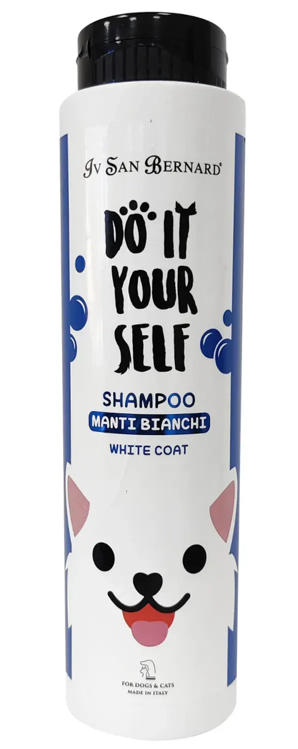 Iv San Bernard Шампунь DO IT YOURSELF для кошек и собак с белой шерстью – специальный шампунь для кошек и собак, устраняющий желтоватые пятна с белого, а также бурые пятна с черного окраса. Обладает деликатным очищающим действием, не содержит окисляющих веществ. При регулярном применении делает окрас более ярким.