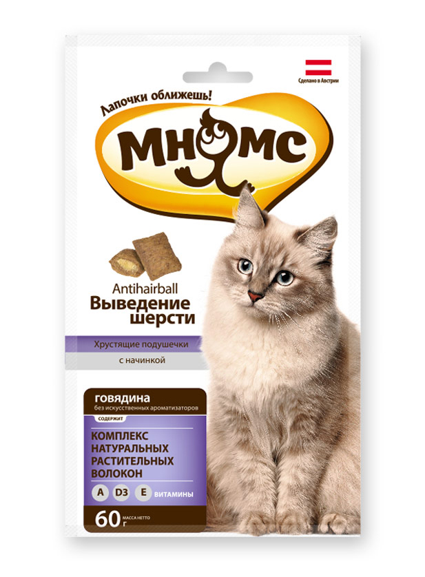 Мнямс Хрустящие подушечки "Выведение шерсти" - это лакомые кусочки для кошек. Благодаря входящим в состав солоду и овсяным волокнам предотвращается образование волосяных комков в желудке животного, активизируется вывод шерсти из пищеварительного тракта.