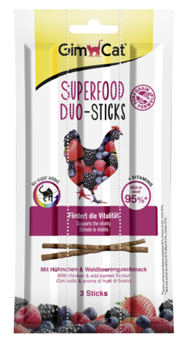 GimCat Палочки с курицей и лесными ягодами - идеальное сочетание курицы и полезных продуктов. Лесные ягоды богаты антиоксидантами и жизненно важными веществами. Содержащиеся в нем витамины способствуют жизнеспособности вашей кошки.