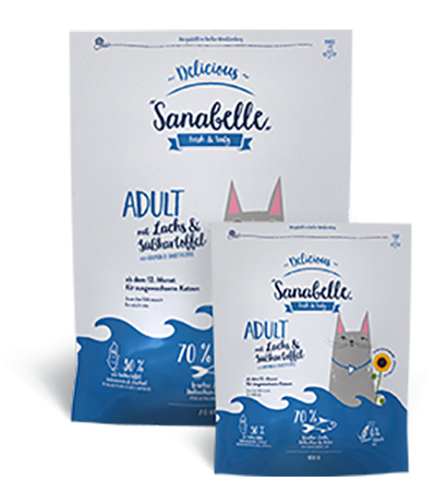 Bosch Sanabelle Delicious (Лосось и батат) - произведён на основе свежего мяса домашней птицы и нежного лосося без использования зерновых, для взрослых кошек всех пород.