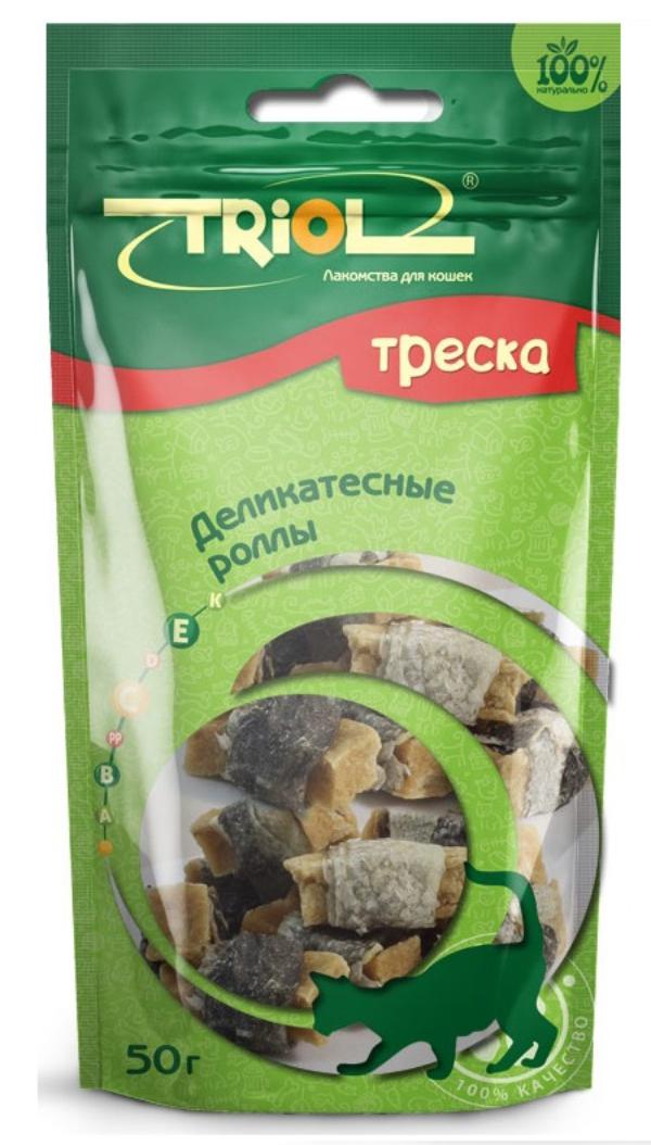 Triol PT34 Роллы из трески — это вкусное лакомство для здоровья кожи и шерсти, обогащенное Омега-3 жирныеми кислотами.