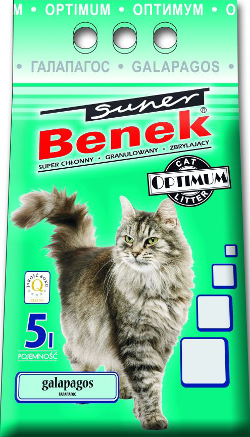 Super Benek - ГАЛАПАГОС ОПТИМУМ - это самый популярный гигиенический наполнитель предназначен для кошек. Очень пористый гранулят, не пылит, комкуется. Впитывает жидкость и неприятные запахи, устраняет грибок и бактерии. Эта серия совмещает преимущества Стандарта и Компакта, одинаково имеют как мелкие, так и крупные гранулы.
