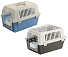 Эта пластиковая переноска выпускается со стальной дверкой, имеющей прочное пластиковое покрытие и закрывающейся снаружи с помощью защелок во избежание ненужных случайных открываний во время поездки. Еще одна металлическая решетка с пластиковым покрытием находится в верхней части.