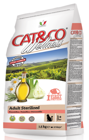 Cat&co Wellness Adult Sterilized (Рыба и рис) — это корм, разработанный для удовлетворения пищевых потребностей стерилизованных взрослых кошек.