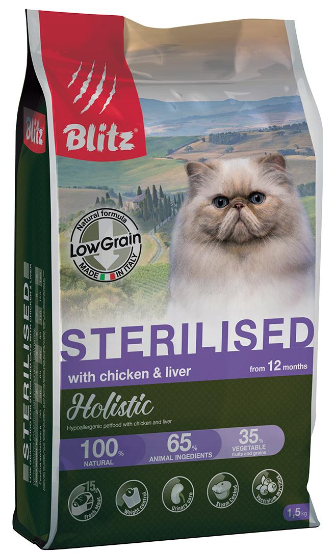 BLITZ Holistic LG Adult Sterilised Cat (Курица, печень) — этот корм разработан специально для кастрированных или стерилизованных кошек и котов всех пород и обладает необходимой калорийностью и питательностью, соответствующей их потребностям.
