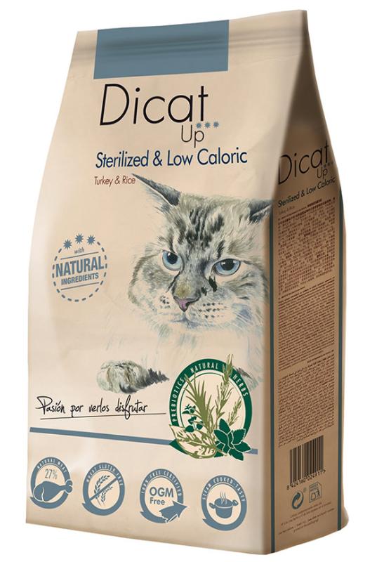 Dicat Up Sterilized & Low caloric (Индейка и рис) — корм для кастрированных котов и стерилизованных кошек с низким уровнем активности или тенденцией к полноте, приготовленный из натуральных волокон с насыщающим эффектом.