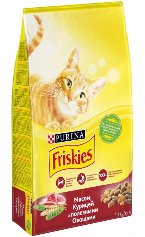Friskies для кошек (Мясо, курица и овощи) — сухой корм для взрослых кошек с мясом, курицей и полезными овощами.