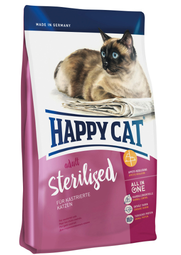 Happy Cat Supreme Sterilised - это полнорационный корм для кастрированных котов, которые склонны к ожирению и заболеваниям мочеполовых путей. Корм обогащен балластными веществами, а также сбалансирован по белкам и жирам. Продукт содержит всего 10,5% жира и 37% (!) качественного белка из мяса лосося и птицы. Корм не нагружает организм кота, а также стабилизирует уровень рН мочи.