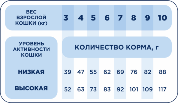 Корм готов к употреблению. Суточная норма может варьироваться в зависимости от индивидуальных потребностей животного. Смотрите таблицу.