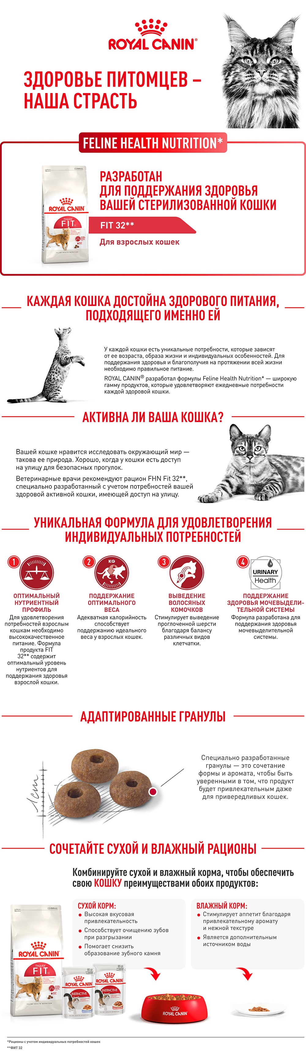 Royal Canin Fit 32 – сухой полнорационный корм поддерживающий здоровье кошек в возрасте от 1 года до 7 лет.