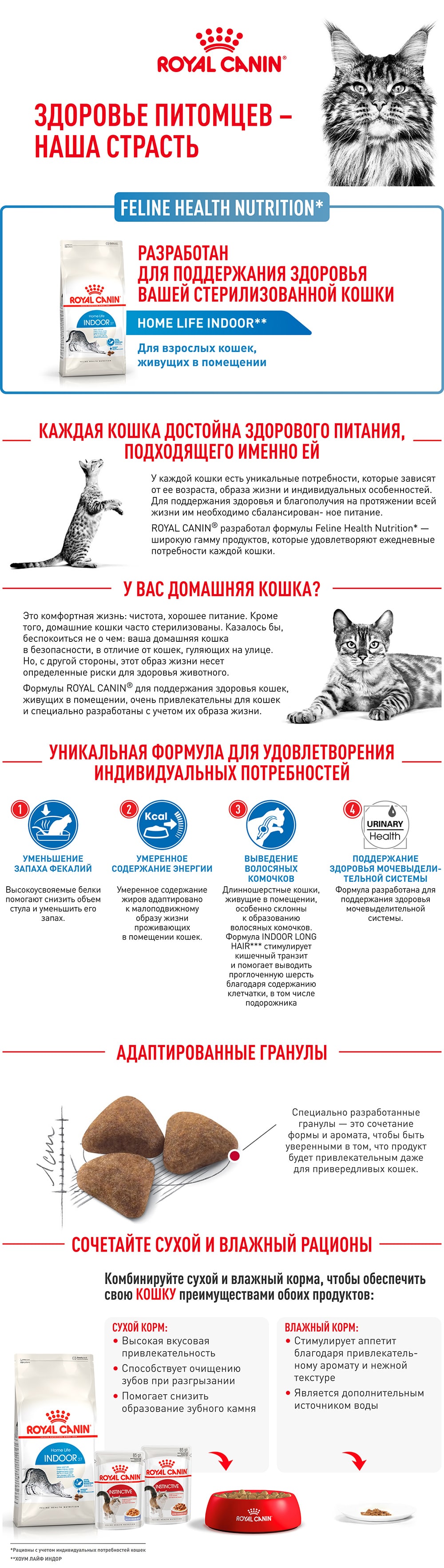 Обратите внимание также и на другие продукты гаммы ROYAL CANIN Indoor: Indoor Appetite Control, Indoor Long Hair и Indoor 7+. Можно выбрать среди них оптимальный с учетом возраста, образа жизни и типа шерсти вашей кошки.