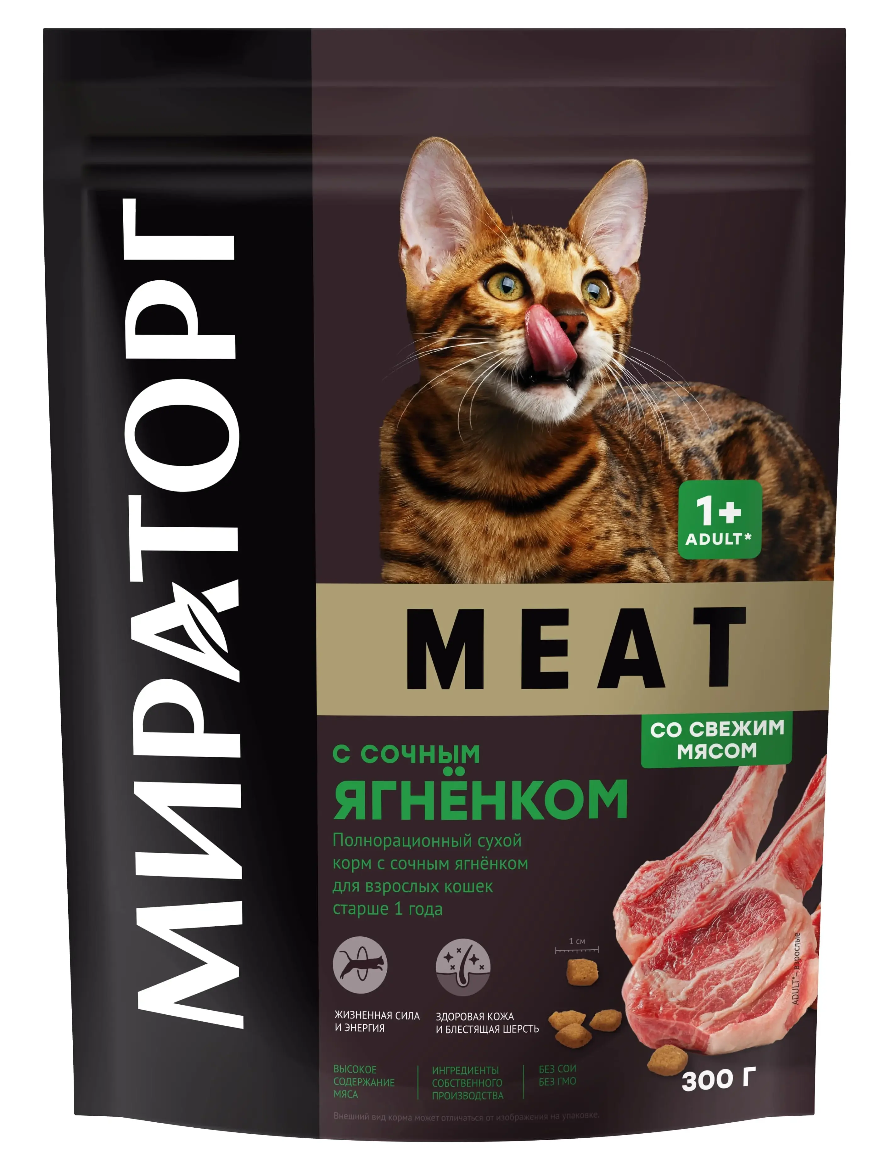 Мираторг Meat для кошек (Ягненок) — полнорационный сухой корм с сочным ягненком для взрослых кошек старше 1 года.