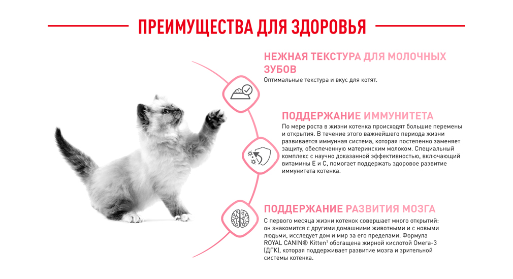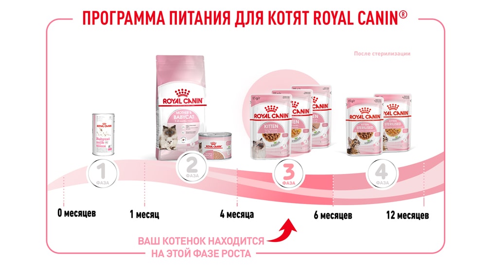 В возрасте от 4 до 12 месяцев скелет котенка продолжает активно расти. Его потребности в энергии еще довольно высоки, но уже начинают постепенно снижаться. Продукт KITTEN в виде мелких кусочков в соусе для котят от 4 до 12 месяцев также оптимально подходит для кошек в период беременности.