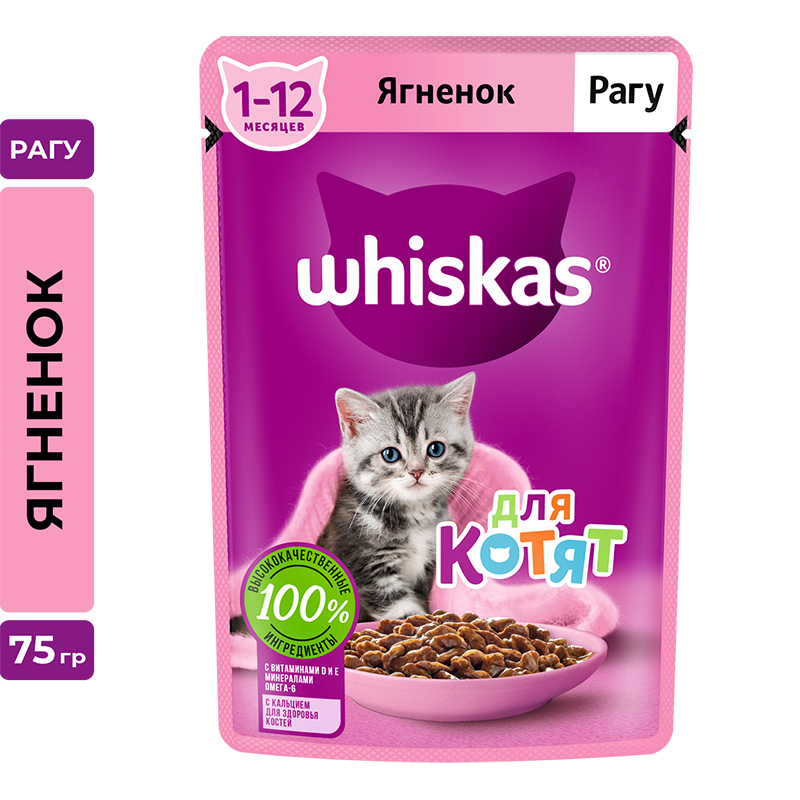 Whiskas для котят рагу с ягненком - это сбалансированный рацион для здорового роста Вашего малыша. Котенок с удовольствием попробует маленькие нежные кусочки с ягненком в ароматном соусе. Рацион Whiskas для котят создан специально, чтобы Ваш малыш получил все самое полезное и вкусное для здорового роста и развития.