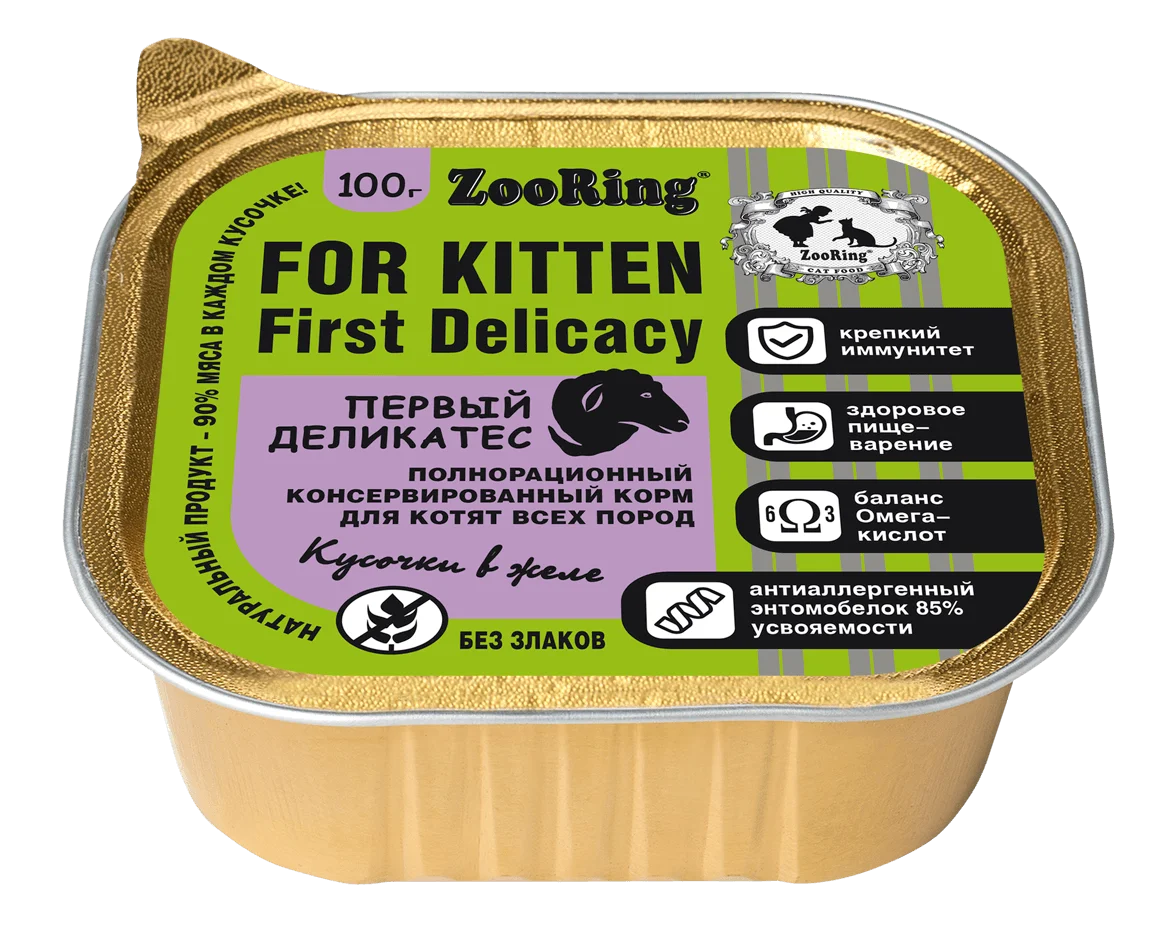 ZooRing Kitten Кусочки в желе с львинкой Первый деликатес — полнорационный консервированный корм для котят.
